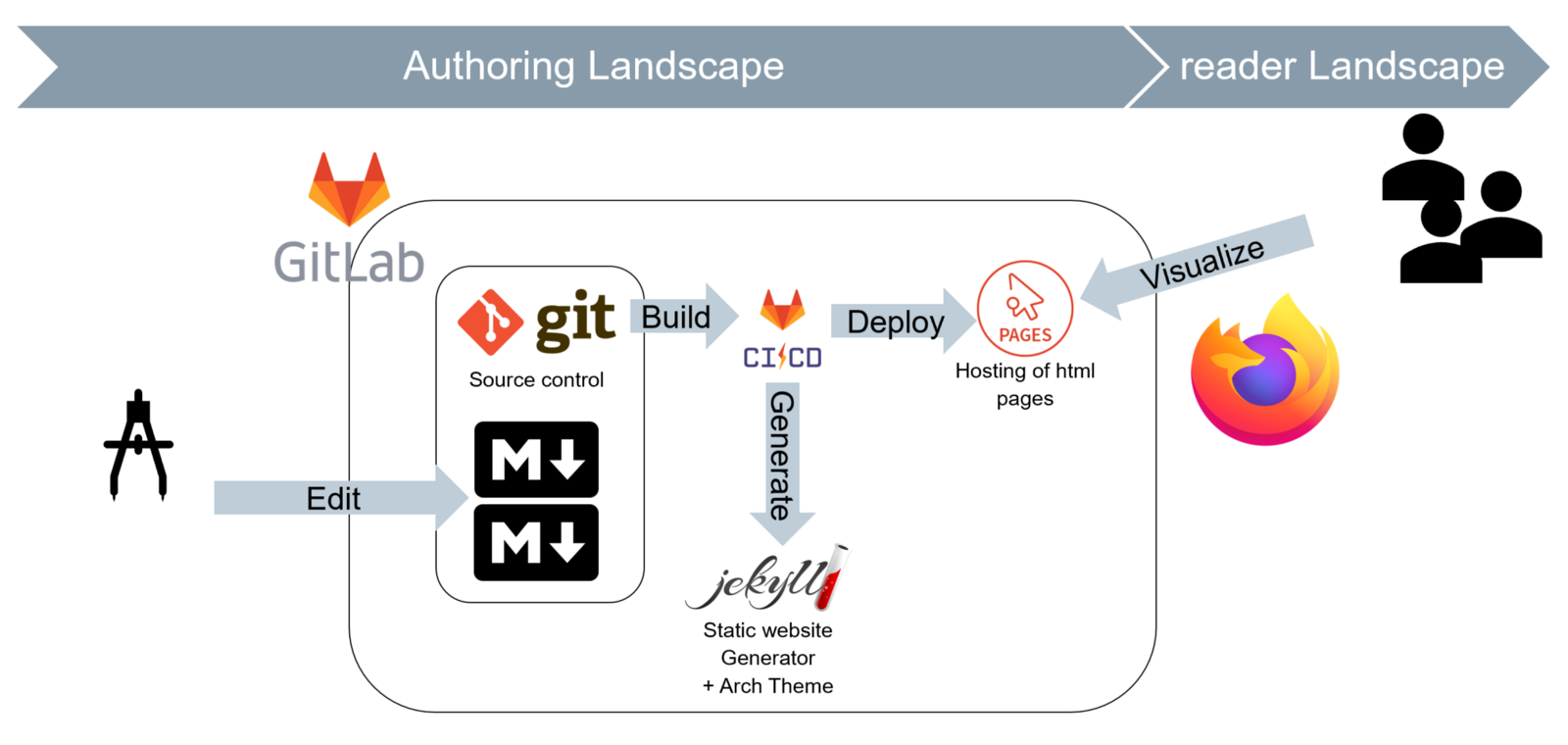Based on those thoughts, the concept of content as code was quite promising. Indeed the same rules should apply for the documentation as for the code. If the architecture is from developers for developers, why not use the same tool landscape (e.g., Git, vscode, or any IDE). Architecture is a living object like code, and it is also a critical asset we can apply the same processes (e.g., Quality gates within a CI, Merge Request…). Architecture and code always diverge over time; maybe putting them together might reduce the risk. We ended with a classical developer tool landscape for the authoring part: Gitlab or any other source control system, markdown for the content, and Git for versioning.